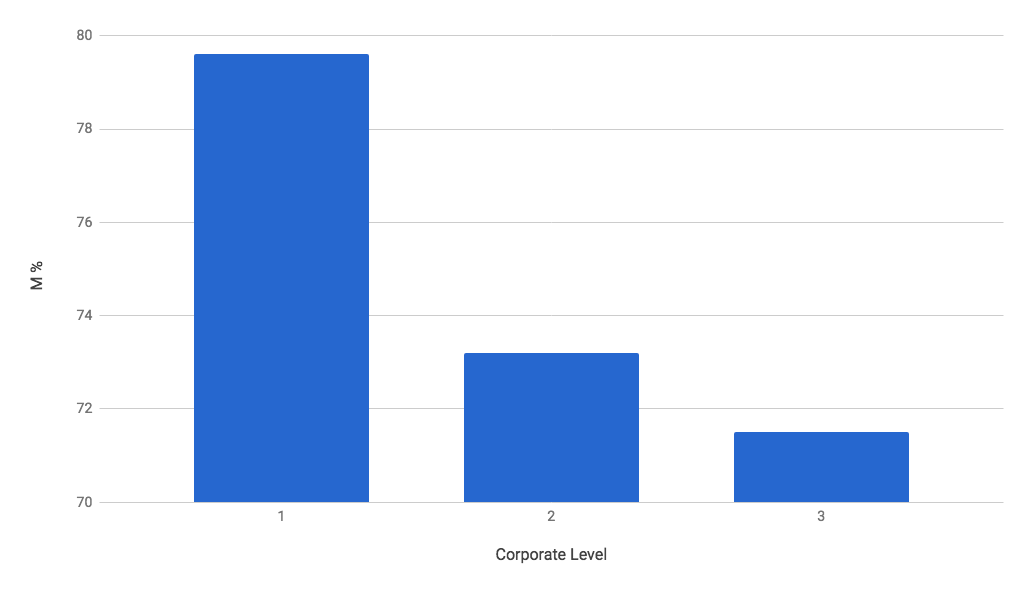 Nearly 20% of speakers in this dataset are CEOs or Owners of their respective companies. As I previously mentioned, 81% of these high-level speakers are male, which certainly skews the overall gender imbalance across conferences.What about the rest of the corporate ladder? Taking conference names and company/role verticals out of the equation now, is gender parity at music conferences correlated with corporate hierarchy?At first, there doesn’t seem to be any clear pattern: