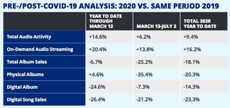 The first quarter to March 12 saw significant fain compared to the previous year with total audio activity up 14.6%, thanks in part of a 20.4% increase in on demand audio streaming. After March 12, audio activity’s growth rate fell to 6.2% and on demand streaming retreated to a 13.8% growth rate. Total albums sales saw a 25.2% drop after March 12 compared to the same period of 2019.