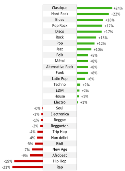 The UCPS model would re-evaluate niche genres: classical (+ 24%), hard rock (+ 22%), blues (+ 18%) for example, but the financial impact (in value) “would be relative to their market share despite double-digit growth.”