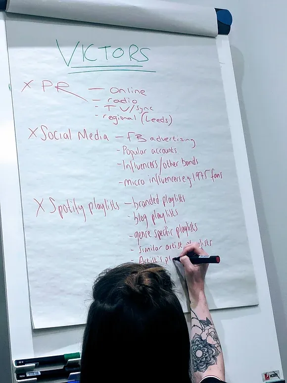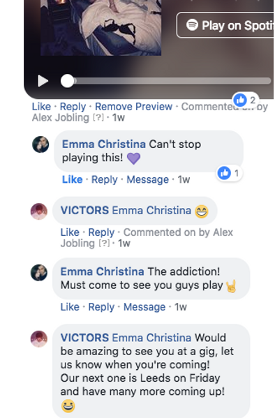 Social Media MarketingIf you haven't been lucky enough to come across Victors social media content, we do suggest you check it out!When we started working with Victors we watched all of their previous vlogs which had been uploaded to their YouTube channel. The band were incredibly talented at creating sketches and funny scenes which we could use as Social Media content to help gain new fans.In marketing the golden rule is that you need to notice a brand 7 times before you make a purchase, and this is no different to artists. Therefore, we used the short clips to raise brand awareness of the band to help convince people to listen to their music.Victors wanted us to help promote their gig in Leeds, UK as well as their music, so to achieve this we created a "sales funnel" which started with using small clips which were engaging and shareable.