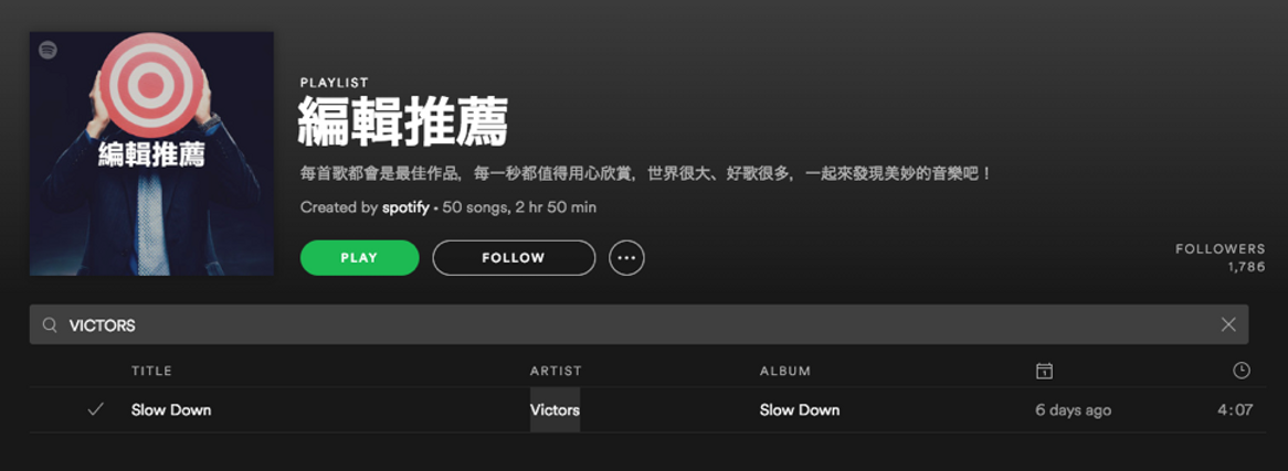 SpotifyOn release day, VICTORS were placed on an Editor’s Choice Spotify Official playlist. The playlist secured them their first few thousand plays, generating Discover Weekly and Top Recommendation placements, triggering further streams.