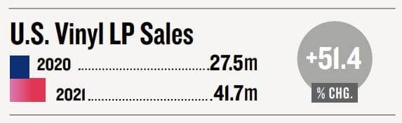 Overall U.S. vinyl sales were up 54% in 2021 totaling 41.7 million albums despite ongoing supply chain issues.