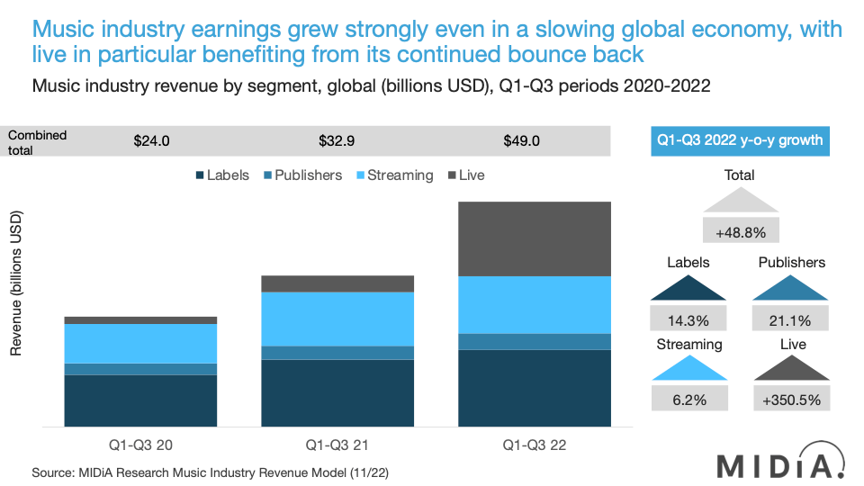 - Live continued its post-Covid rebound, with dramatic growth, benefiting from the still strong latent demand both from consumers and artists, eager to get touring again. However, with going out and going to concerts being the main things that consumers state they will cut back on during the recession, live may find the coming year more difficult than music rightsholders and DSPs.