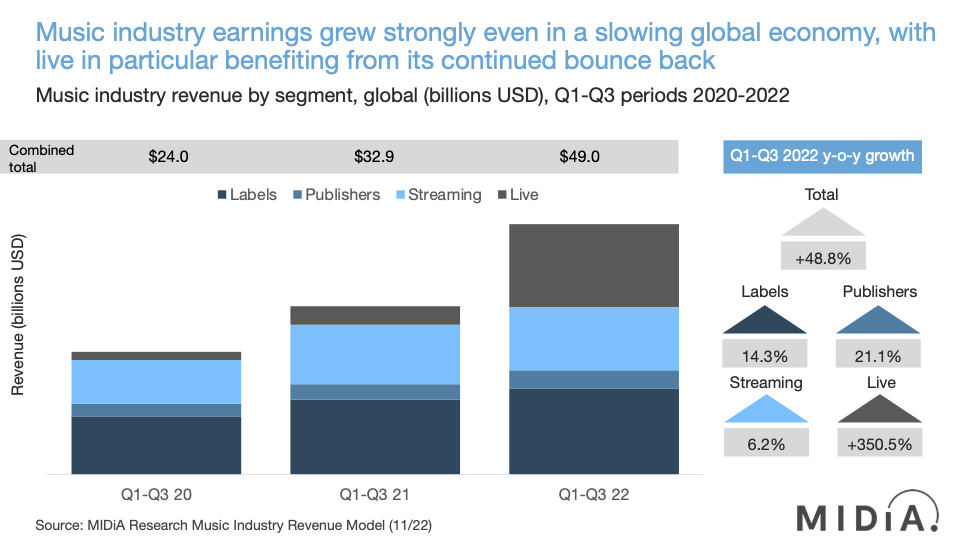 - Live continued its post-Covid rebound, with dramatic growth, benefiting from the still strong latent demand both from consumers and artists, eager to get touring again. However, with going out and going to concerts being the main things that consumers state they will cut back on during the recession, live may find the coming year more difficult than music rightsholders and DSPs.