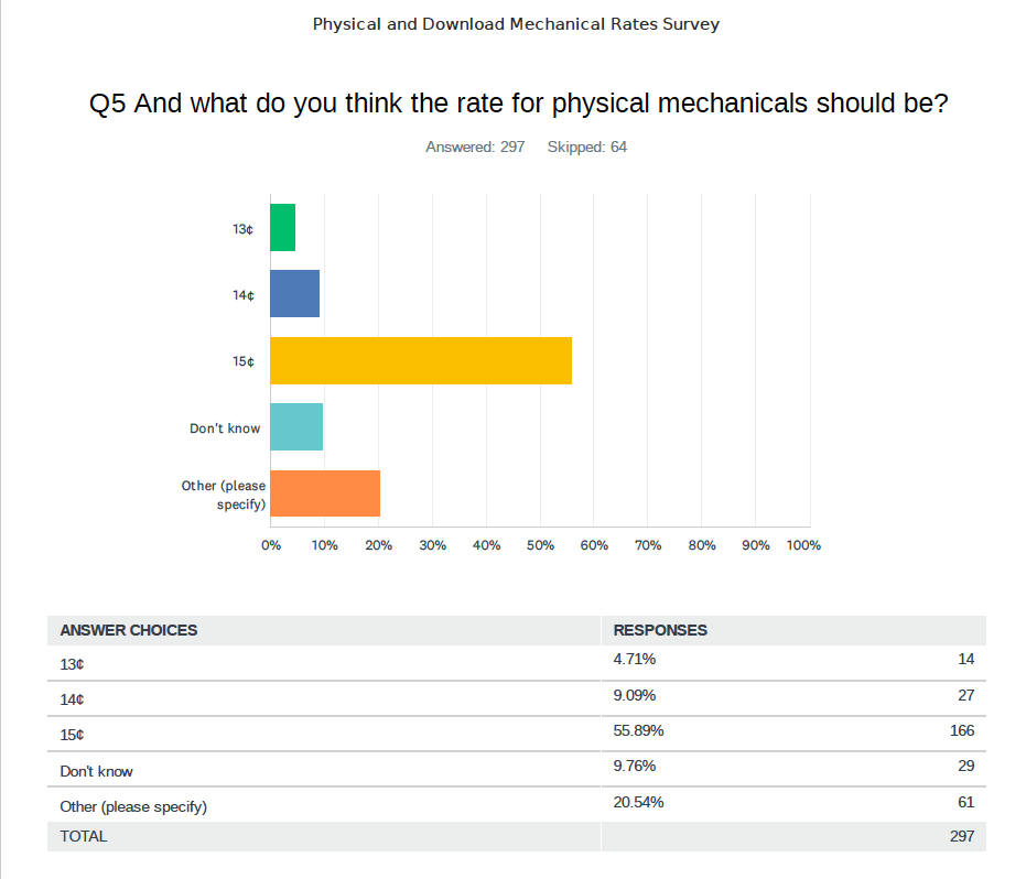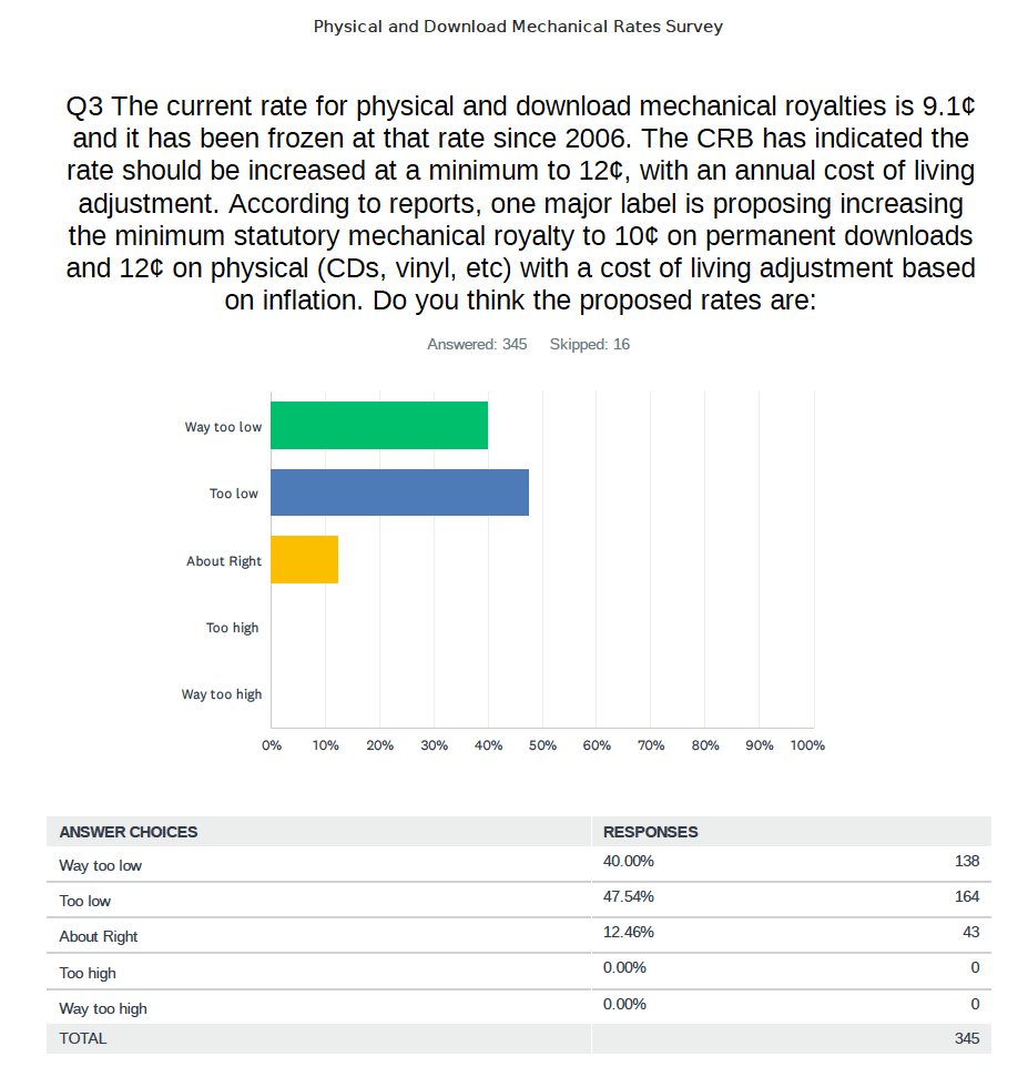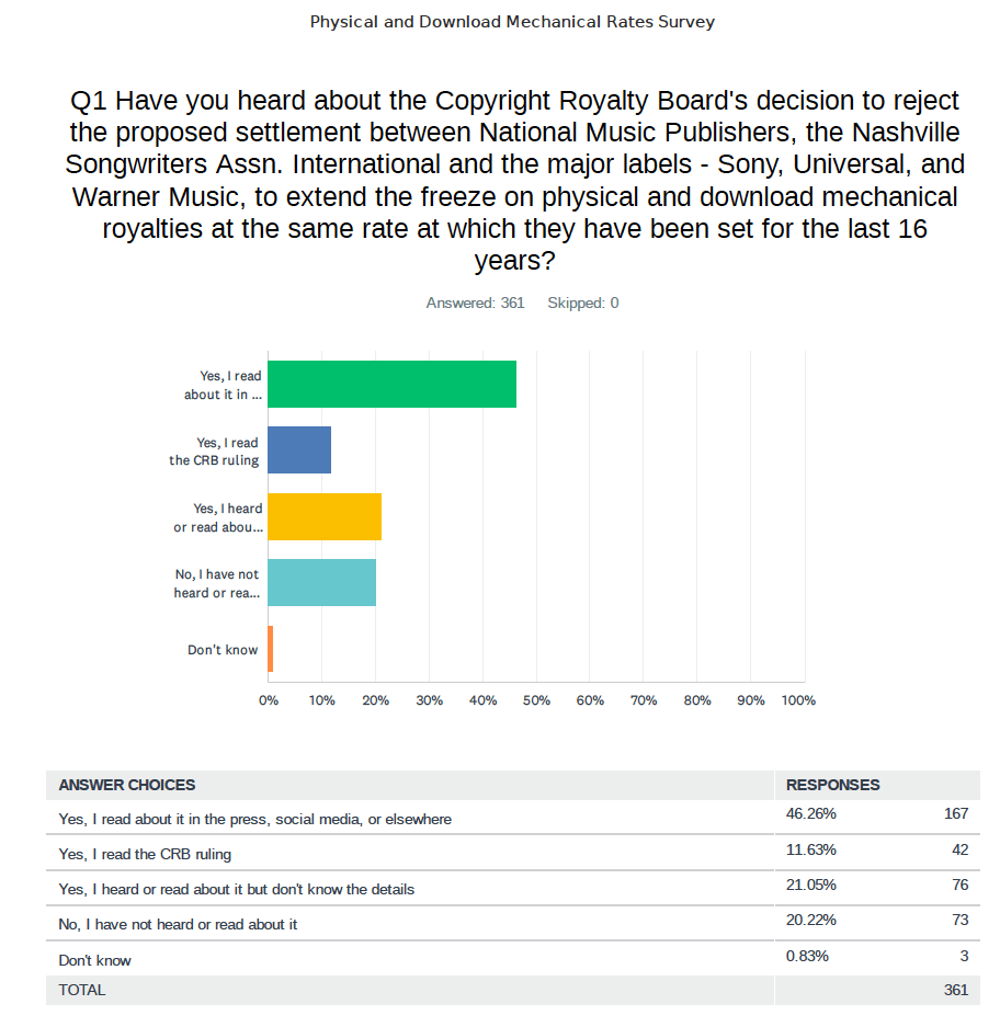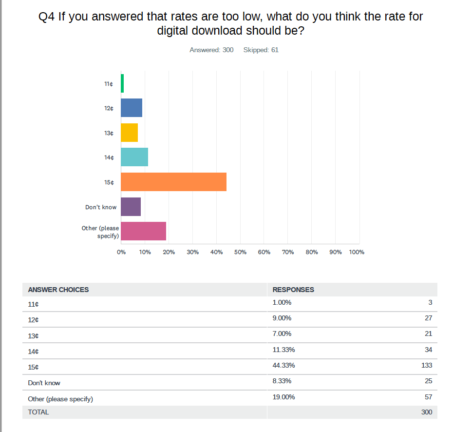 Many readers participated in the Physical and Download Mechanical Rates Survey that various organizations have sent to their members over the last few weeks. Here are the results of the main questions for which we had 361 respondents who self-selected their participation. (Other answers included comments which we chose not to publish for privacy reasons.).