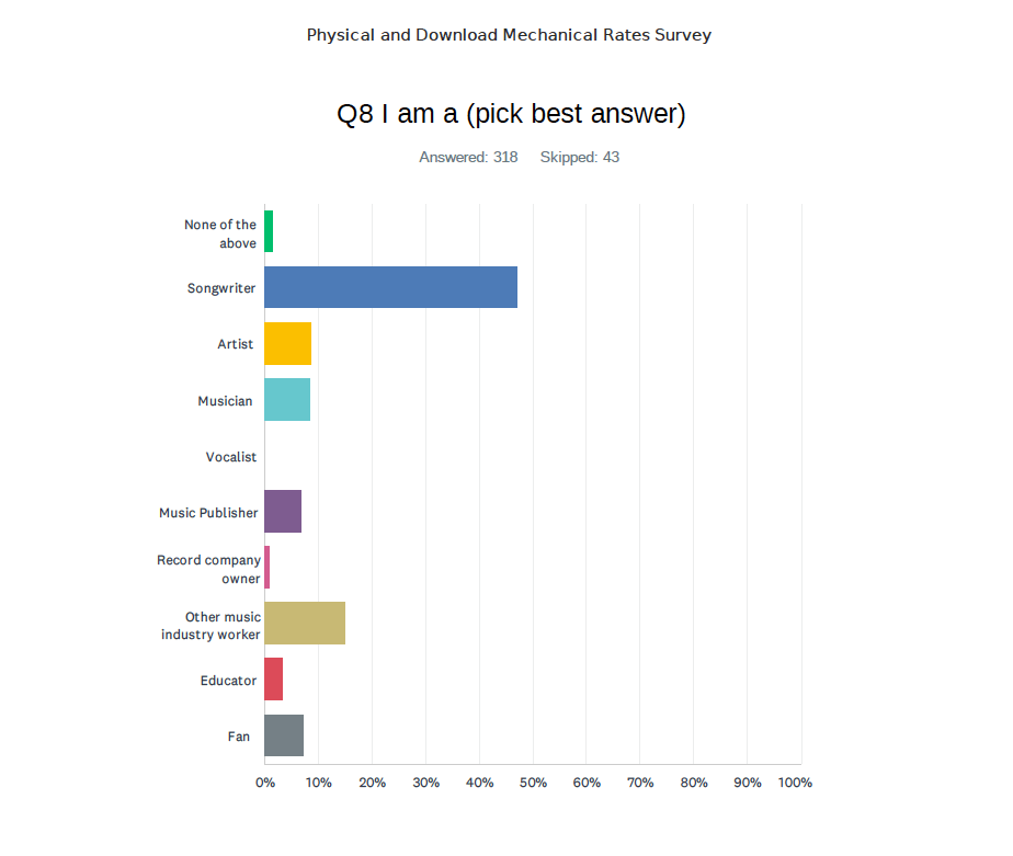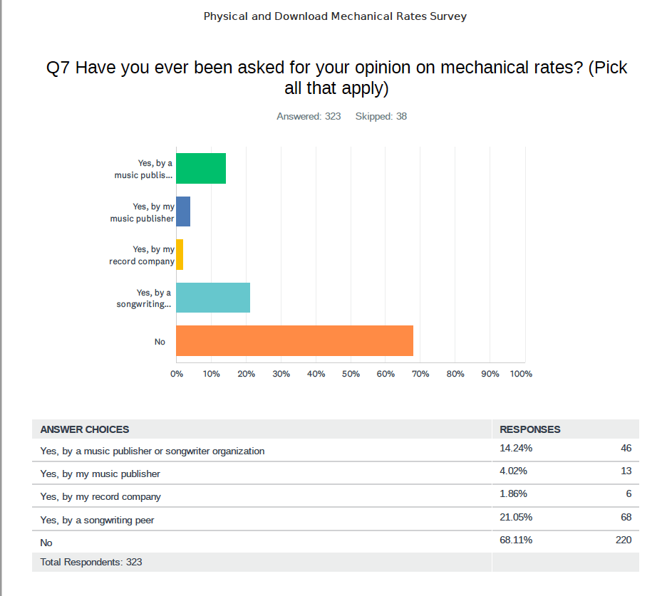It also is striking how few respondents said they had ever been asked what they think about any mechanical rates (physical, download, streaming), an important and easily measurable issue. This is something to add to the learning from this episode. It may be that our data is skewed, but even so we didn’t expect that 68% would say they’d never even been asked their opinion. An easy way to find out what people think about something is to ask them.