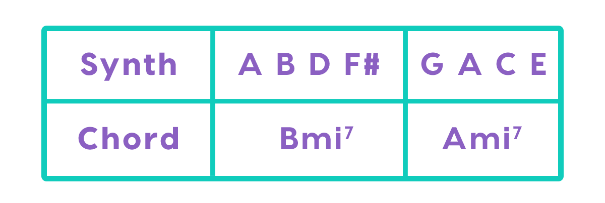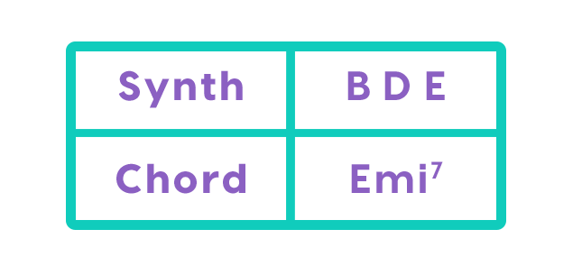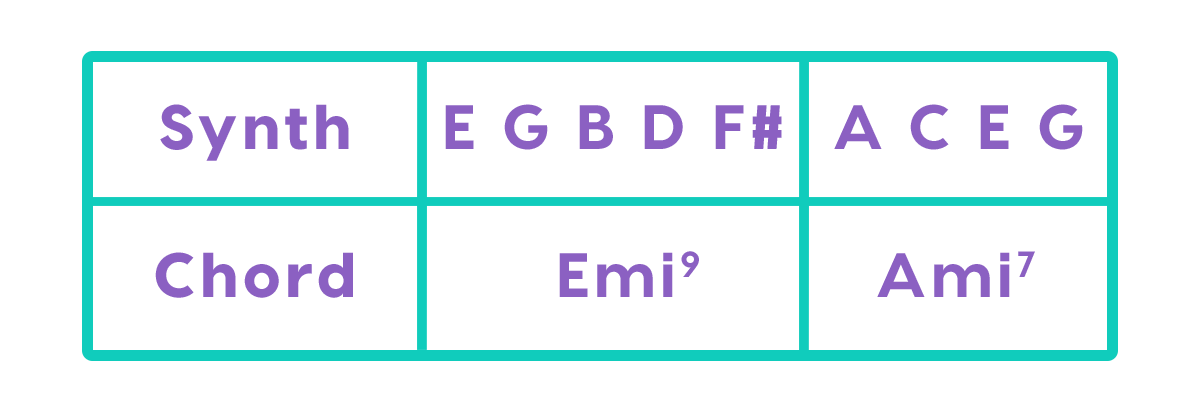 The ’80s synth string sound makes it hard to distinguish the pitches. I can’t actually detect whether the first chord contains a G. Since Tennant described this chord as a “G major 7th with an E bass,” I’ll include the G, but the chord quality isn’t strongly affected by its presence or absence. We readily recognize this as an Emi9-Ami7 progression.