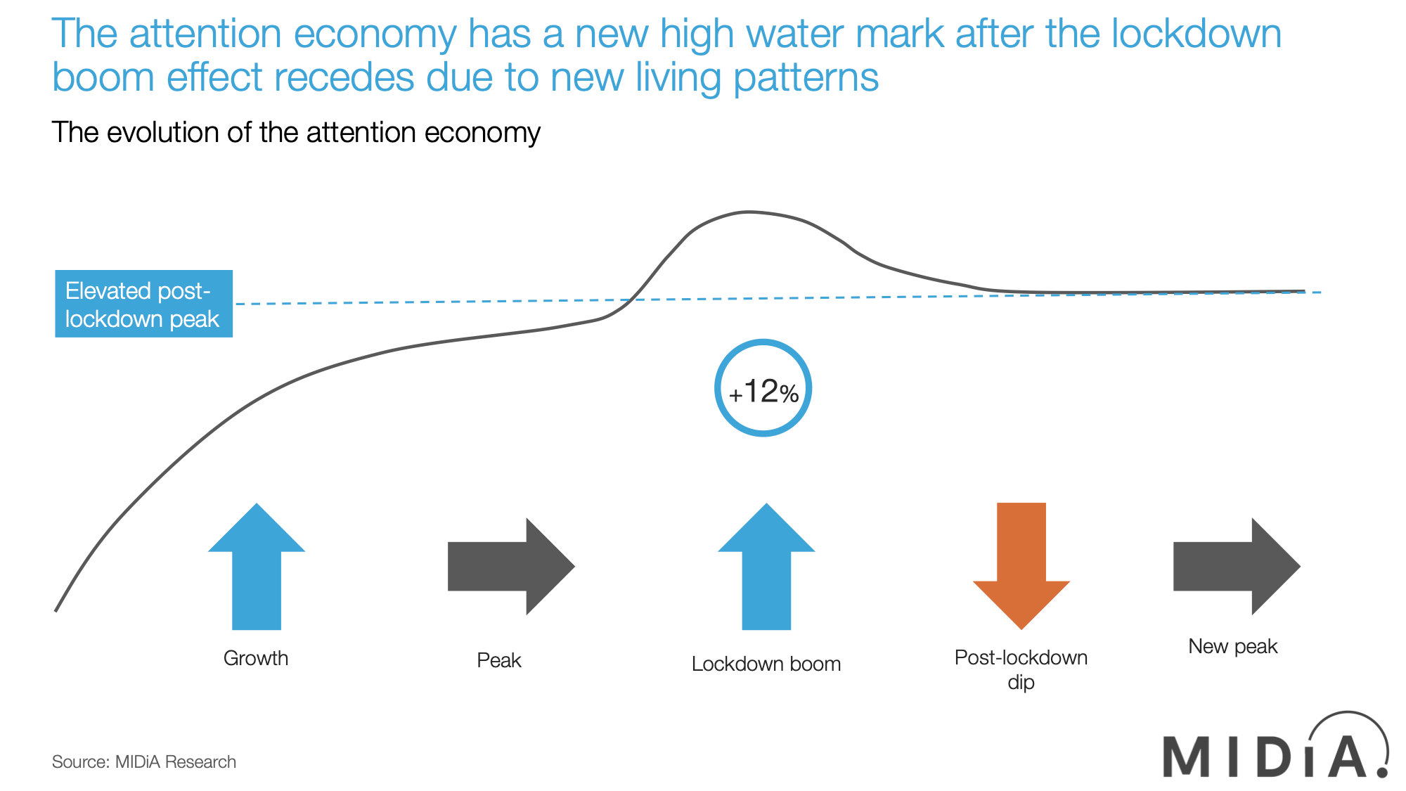 - Lockdown boom (2020-2021): Just before the effects of peak attention began to be felt, the global pandemic hit, opening up a new wave of attention growth. During the lockdown boom, media time went up by 12% and all forms of home entertainment boomed.