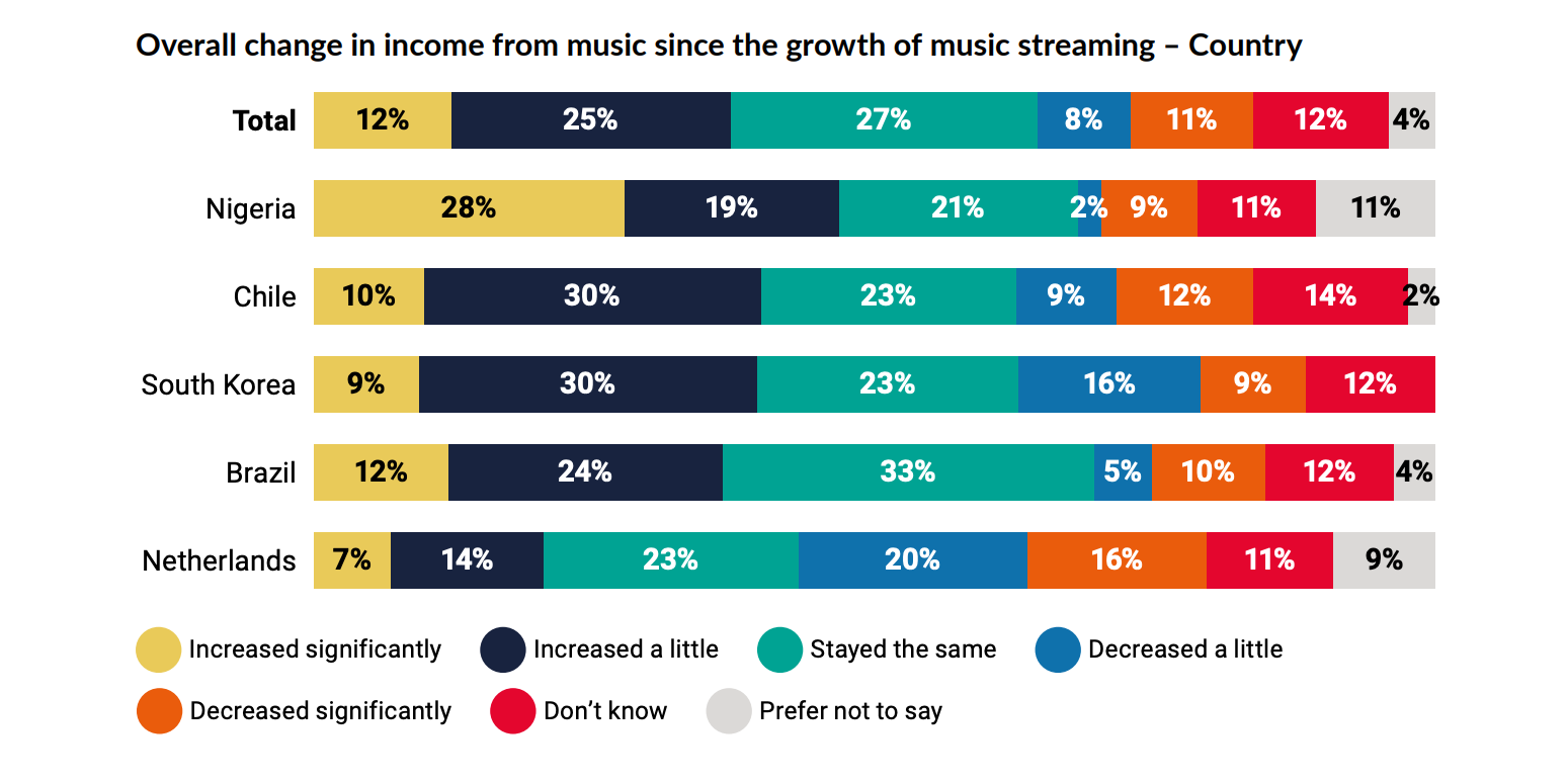 Titled “Musicians at Work in the Platform and AI Era,” the study surveyed more than 1,200 artists across the unique, rising music markets of Brazil, Chile, the Netherlands, Nigeria, and South Korea.