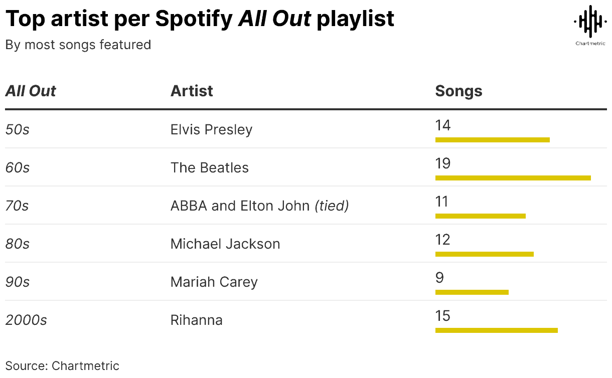 Another fun thing about this data is that it provides additional context on some classic musical debates. For example, who’s the quintessential 1960s act, The Beatles or The Rolling Stones? According to the playlist data, it’s The Beatles by a country mile. The Fab Four have had 19 different songs appear on All Out 60s over the last few years, while The Rolling Stones have only had 10 — putting them in third place behind Bob Dylan. Via this logic, it is possible to crown the dominant musician of each decade.