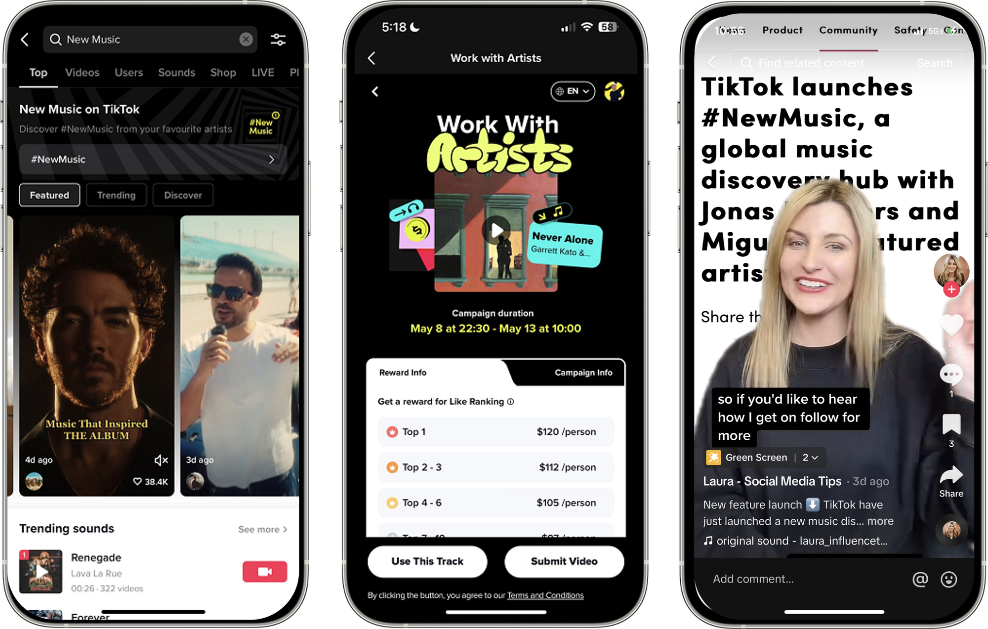 The middle screen grab shows their “Work With Artists” feature designed to provide more exposure for new musicians on TikTok. Hutchinson notes the importance of audio on TikTok videos, and points out how musicians can offer incentives for content creators on the platform to integrate their songs.