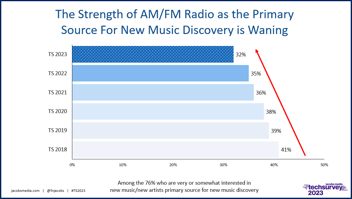 Considerably fewer want to be a program director or even an air personality. Maybe that’s because the music component in radio has been eroding for some time now. There’s not a lot to discover. When I look at our newest Techsurvey, broadcast radio as a discovery mecca continues to lose altitude with each passing year. True, the radio audience is aging, moving further away every year from the new music sweet spot.