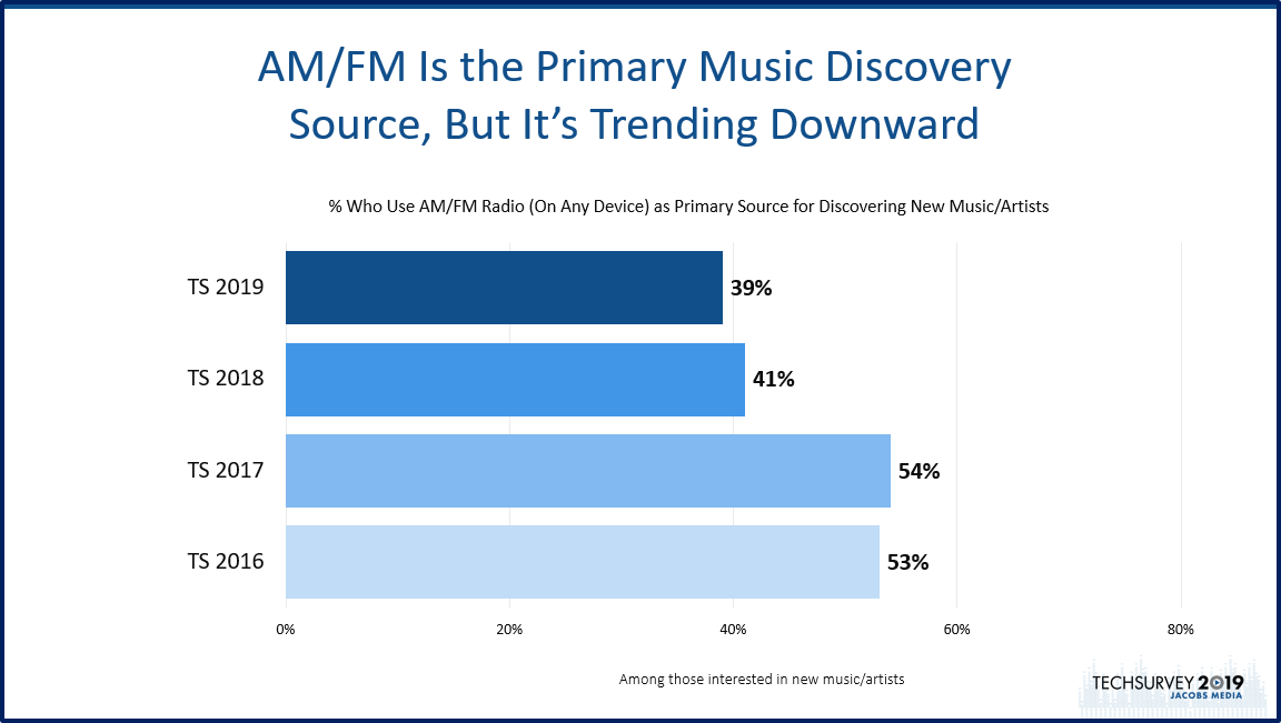 That said, there’s a pattern when we look back at the role broadcast radio plays in the discovery of new music. In our survey, radio is well ahead of other sources – satellite radio, streaming services, YouTube, and even friends and family. That’s the good news.