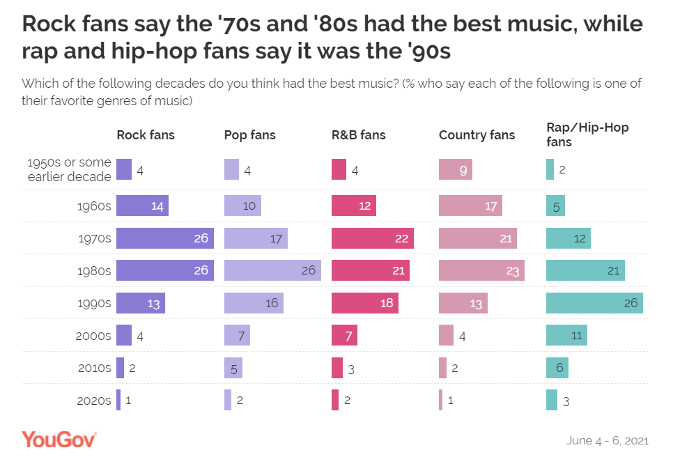 And for Rap/Hip-Hop, the YouGov number indicate those “throwback” radio stations are onto something. A solid plurality point to the 90s as the epicenter of their musical tastes.