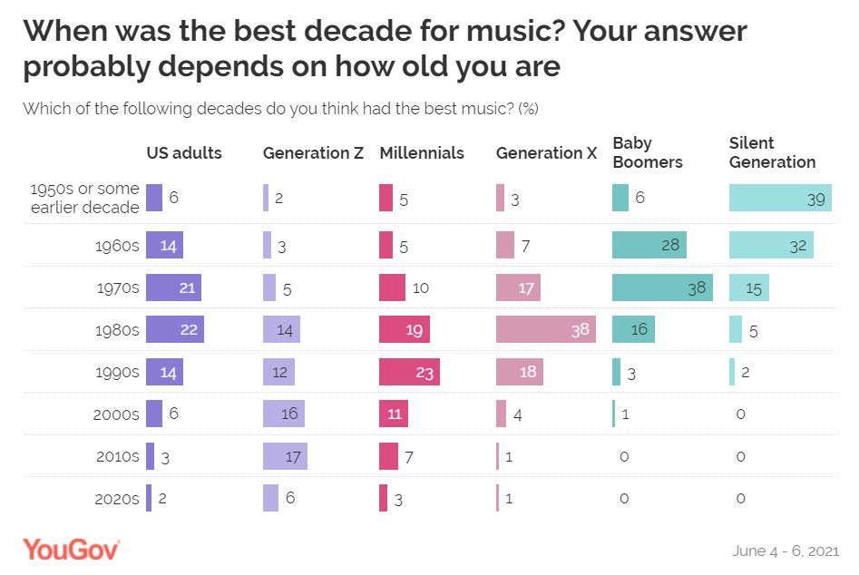 For radio, funding for research post-pandemic has been in short supply. Fortunately new research from YouGov may help fill the void, and has some interesting data about listeners favorite decades for music.