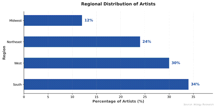 Southern states account for 34 of 100 breakout artists, outpacing the West (30), Northeast (24), and Midwest (12).