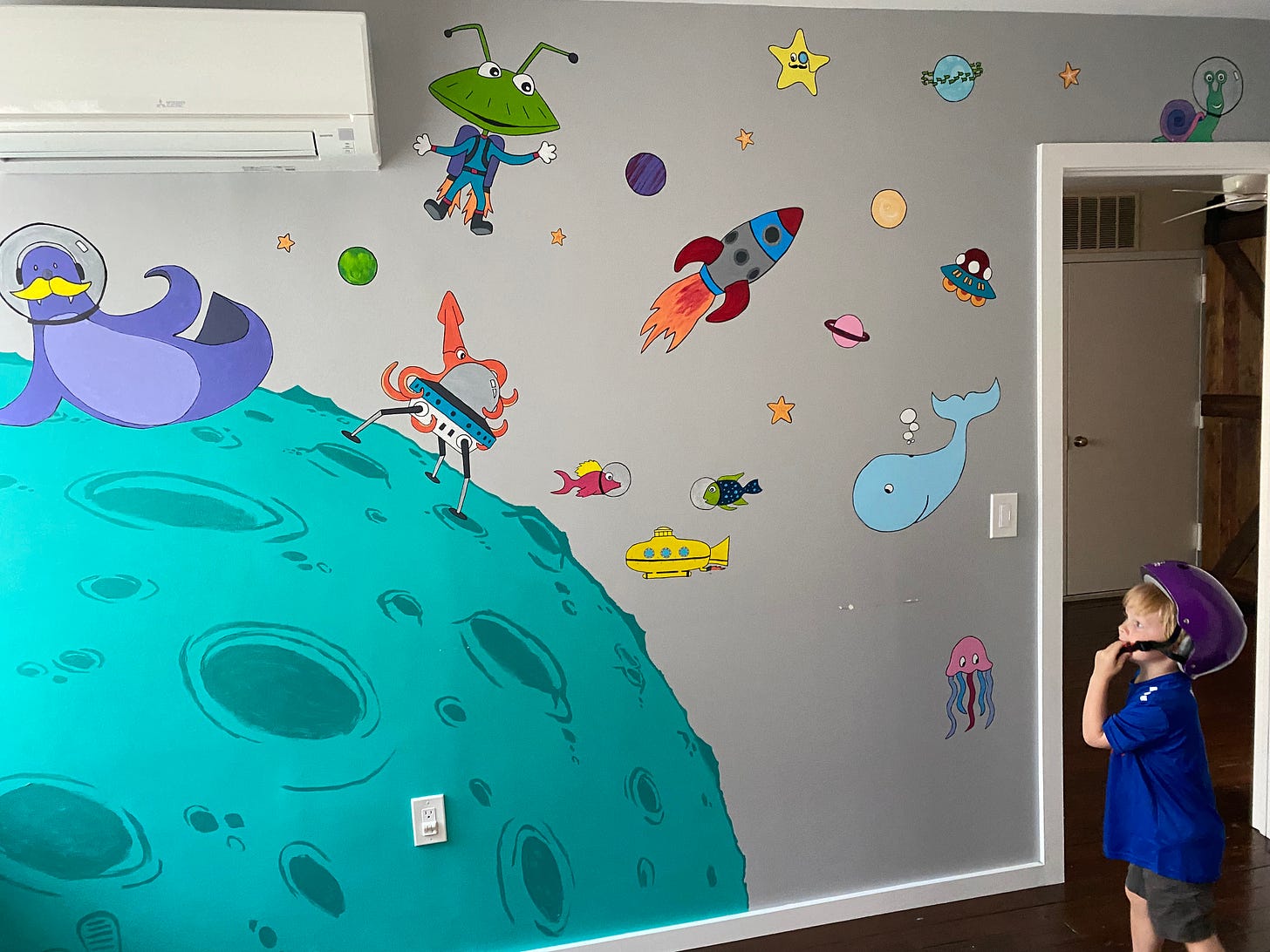 And yet, despite not being a great freestyler, I feel myself to be a very creative person. I make a lot of stuff — art, music, projects, coloring books, giant snake heads for candy chutes on Halloween. I once made a mural on my kid’s bedroom wall of an underwater / outer space scene that involved a giant squid wrestling with a spaceship. I improvise on the piano every single day.