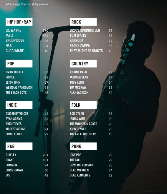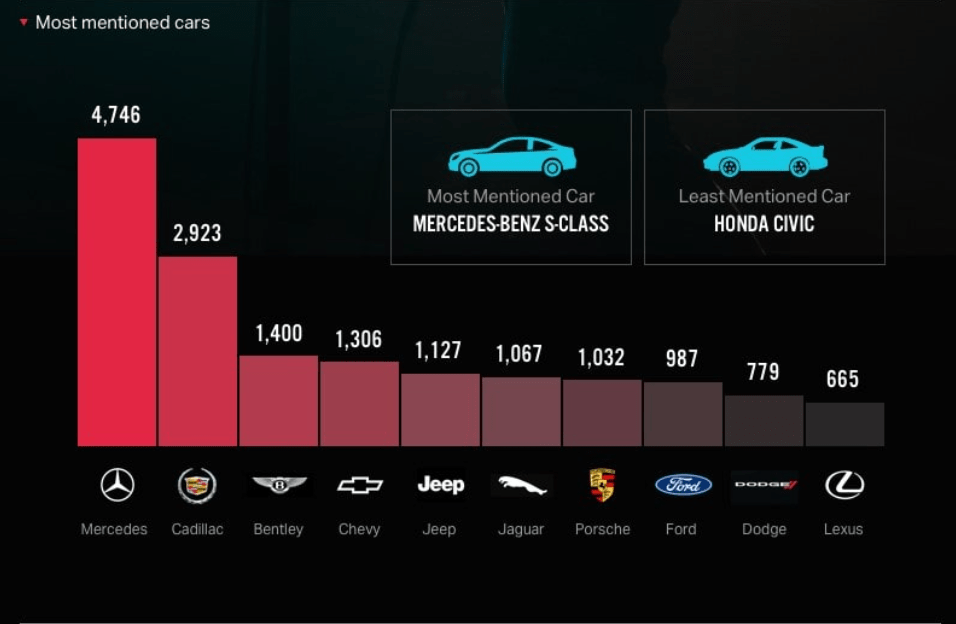 Guest post by Fred Jacobs of Jacobs Media StrategiesIn yesterday's post, we looked at radio's sales outlook for automotive ad dollars, as well as the way car companies continue to use Classic Rock soundtracks to brand their new makes and models.And as promised, we're going to take that one giant step forward and make that connection between music, radio, and cars. That's because so many musicians and performers have crooned about cars.As a Detroit guy firmly rooted in both the radio and automotive industries, it's a topic that hits home. When you live in the Motor City, frequent conversations revolve around the car you drive, the music you love, and the radio stations that bring it all together whether you're driving on the John C. Lodge Freeway, Woodward Avenue, or Telegraph Road.And now thanks to analytics and word search, it's possible to quantify that magical relationship. Gold Eagle, a Chicago-based automotive mainteance products supplier used the services of Digital Third Coast to conduct lyric-based research to determine which format genre most frequently refers to our four-wheeled friends – our cars.Here's how they did it:Matt Zajechowski, Digital Third Coast's Outreach Lead (and Phish phanatic), explains how his company analyzed 100,000 songs using the lyrics.com database. To make the determination, they used scores of search terms, including cars, trucks, 4X4, coupe, sedan and “hooptie.” They also included many makes and models of cars and trucks, like Escalade, Caddy, Mustang, Jeep, and Jag, as well as terms like F-150 and C-Class.And the result?It turns out that automotive is very much a key part of the music we listen to – and program. Overall, 13,000 artists and 72,000 songs mention car search terms somewhere in their lyrics.That's a lot of car talk.But the big question is this: Which musical genre leads the league in car lyrics – Rock, Hip-Hop, Country, or another format entirely?This automotive contest isn't even close. Hip-Hop is the runaway leader. Of the top 100 performers who mention cars in their songs, 94 are hip-hop artists or rappers.In fact, the top 3 are Lil Wayne, Jay-Z, and Snoop Dogg.Rock is right up there, led by Bruce Springsteen. The Boss is followed by Tom Waits, Kid Rock, and Frank Zappa.And Pop songs often contain lyrics about cars, headed up by Jimmy Buffet and Prince, while topping the Country top charts are Johnny Cash and Jason Aldean.It's seems notable that novelty artists like Zappa and Weird Al Yankovic show up on the list, along with cultural icons like Cash, Dylan, and Iggy Popp. Cars are part of the formula for writing hit songs, and dashboard radio is the conduit that brought it all together.Here's a slice of the Gold Eagle/Third Coast Digital infographic that provides artist-level data for car lyrics: