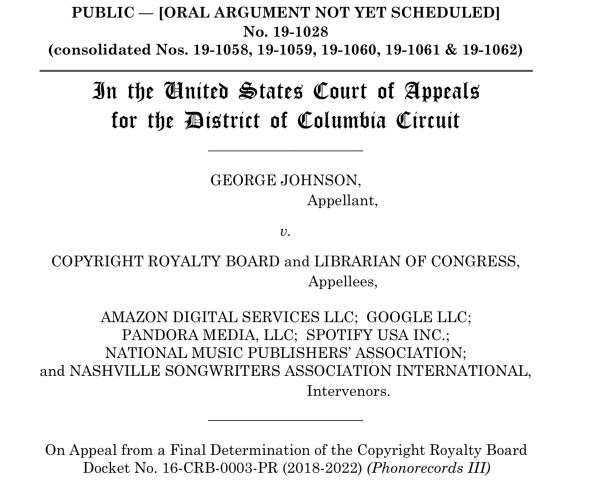 George Johnson is not a household name but he’s one of my heroes. If you are a songwriter you probably should pay attention to what this scrappy indie songwriter is doing. He may end up being a hero to you as well. The screen capture above says it all. One lone songwriter against the US federal government, Amazon, Google, Pandora, Spotify, The National Music Publishers Association (NMPA) and Nashville Songwriters Association International (NSAI).