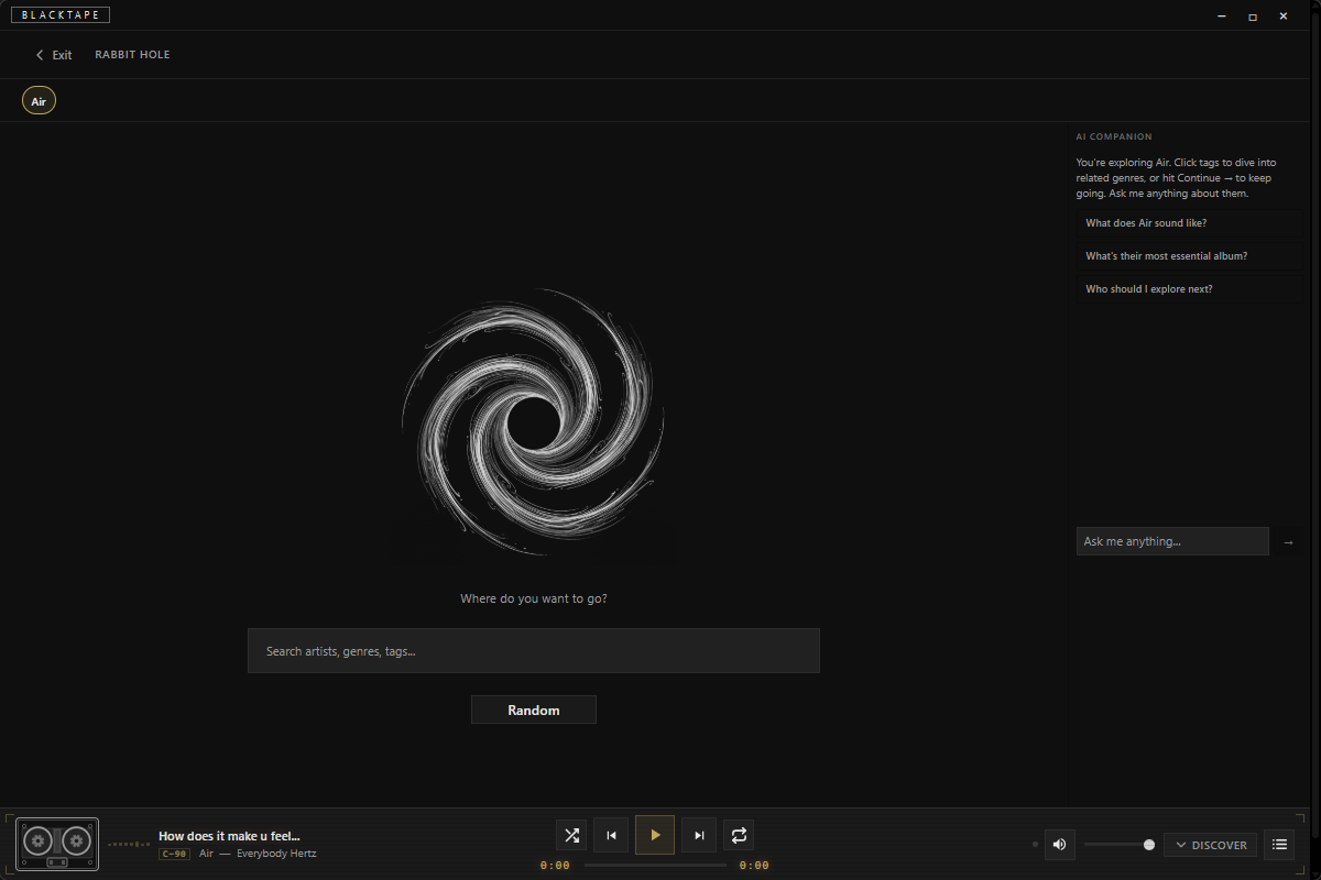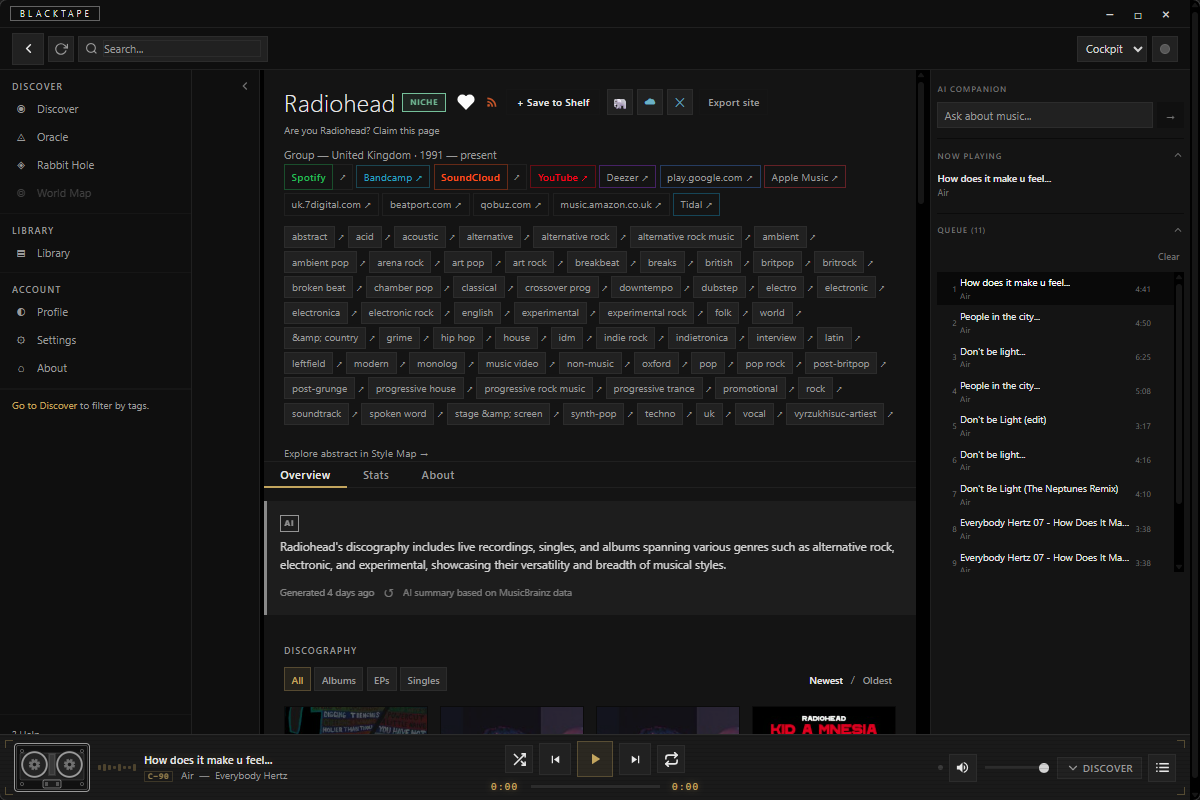 I wanted to understand how music connects — not just find individual artists but see the relationships between them. How post-punk revival differs from traditional punk. How hyperpop relates to mainstream pop. How vaporwave and lo-fi hip-hop share roots but diverge. BlackTape lets you trace those lines. Search by genre, by country, by decade. Follow influences. Explore discographies. See how a sound evolved from one scene to another.