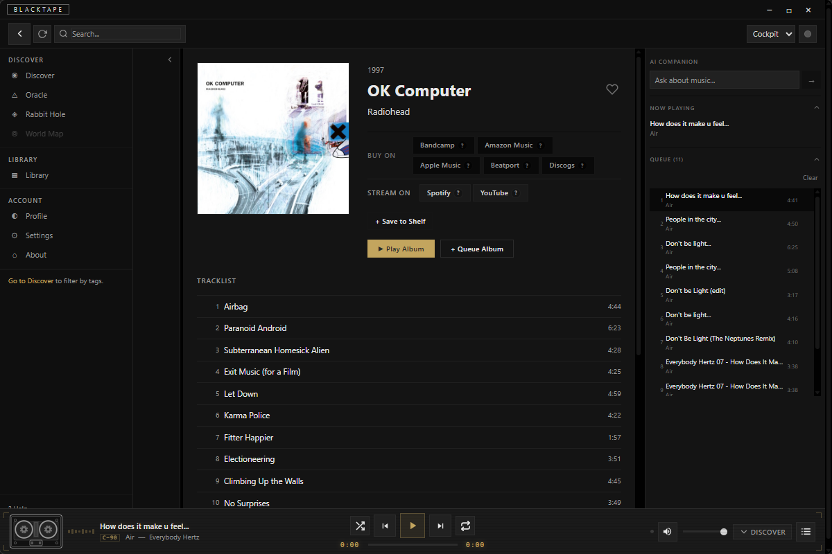 If you find something through BlackTape and want to support the artist, buy the record. Grab it on Bandcamp. Or just keep listening. The app doesn't care how you engage — it has no business model that depends on keeping you inside a walled garden. That's the freedom you get when discovery isn't a feature of a platform but a tool that belongs to you.