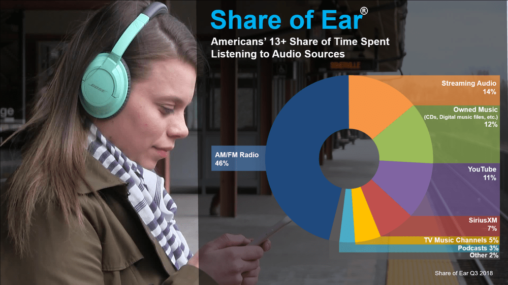 Share of Ear is an ongoing audio listening diary survey that measures all audio respondents listen to during a 24-hour period. “We learn what they’re listening to, how much they listen and when, where they listen, and what device they listen on.”
