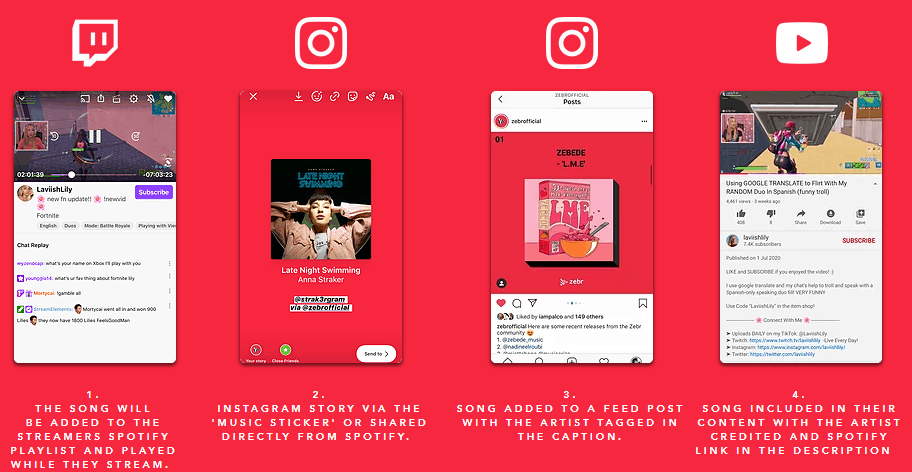New app Zebr enables music submission to influencers and content creators on TikTok, Instagram, Twitch, YouTube and Spotify who reach millions of people daily.
